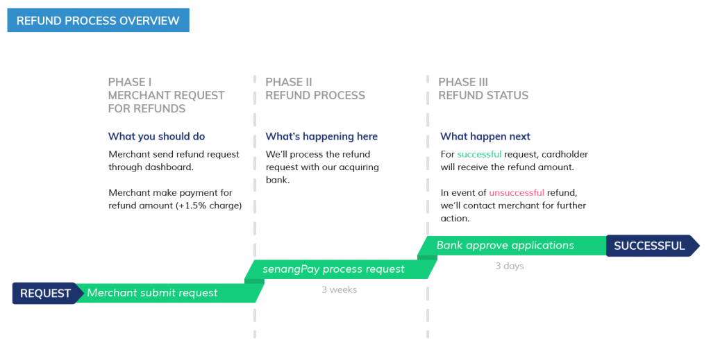 1. The merchant that initiates refund for customers will be subjected to a service charge fee of 1.5% for credit and debit card from the total amount requested.